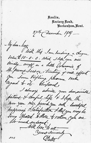 With this I am sending a cheque value £10.0.0. which I hope you will kindly accept as a little Souvenir of the present Season, trusting it will afford you some trifling pleasure with regard to its disposal.