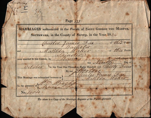 MARRIAGES solemnized in the parish of SAINT GEORGE THE MARTYR, SOUTHWARK, in the COUNTY OF Surrey, in the Year 1834 Charles James Fox of this Parish Batchelor and Matilda Waker of this Parish Spinster were married in this Church by Banns with consent of - this Ninth Day of October in the Year One Thousand Eight Hundred and Thirty Four By Me J Horton This Marriage was solemnized between us Charles James Fox Matilda Waker in the presence of Wm. Wright Maria Fox No 404.