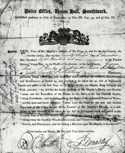 Police Office, Union Hall, Southwark, Established pursuant to Acts of Parliament, 32 Geo III. Cap 53, and 36 Geo. III Cap. 75 Surrey. WE, Two of His Majesty’s Justices of the Peace in and for the said County, do hereby certify, that on this Twenty Second Day of December One Thousand Eight Hundred and One at the Police Office, Union Hall, in the Parish of St. Saviour, in the said County, George Fox of Harley Street in the Parish of Marylebone in the County of Middlesex Gentleman personally came before us, and then and there did take the Oaths of ALLEGIANCE and SUPREMACY, as settled in, and directed to be taken by an Act of Parliament made and passed in the first Year of the Reign of His late Majesty King GEORGE the First intituled “ An Act for the further Security of His Majesty’s Person and Government and the Succession of the Crown in the Heirs of the late Princess Sophia, “being Protestants; for the extinguishing the Hopes of the Pretended Prince of Wales, “and his open and secret Abettors”: AND ALSO the Oath for the true and faithful Execution of his Office as one of the GAGERS of his Majesty’s EXCISE, as is also settled in and directed to be taken by an Act of Parliament made and passed in the Twelfth Year of His late Majesty King CHARLES the Second intituled “AN Act for “taking away the Court of Wards and Liveries, and Tenures in Capite and by Knights “Service and Purveyance and for setting a Revenue upon His Majesty in lieu thereof.” Given under our Hands the Day and Year above written. R Smith ?P Broadley London 31 July 1802 Cut in the Auditor’s Office For Excise S. Webb.