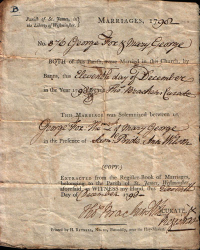Parish of St James in the Liberty of Westminster MARRIAGES 1798 No 876 George Fox & Mary George BOTH of this parish were married in this Church by Banns the Eleventh day of December in the Year 1792 By me Tho.s Bracken Curate This marriage was Solemnized between us George Fox: x mark of Mary George in the Presence of Sam.l Pride. Ann Wilson (COPY) ETRACTED from the Register –Book of Marriages, belonging to the Parish of St James, Westminster, aforesaid as WITNESS my Hand this Eleventh Day of December 1792 Tho.s Bracken CURATE. x Registrar