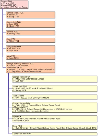 It appears to be George Hamlin Fox (or Hamlyn) who first moved to London from Devon. He married Mary George who was from Hatton in Warwick on 11 December 1798 at St James, Piccadilly, Westminster.