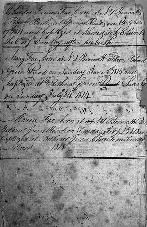 Mary Fox born at No 1 Bennett Place, Bethnal Green Road on Sunday, June 5th 1814 and baptised at Bethnal Green Church on Sunday July 24th 1814
