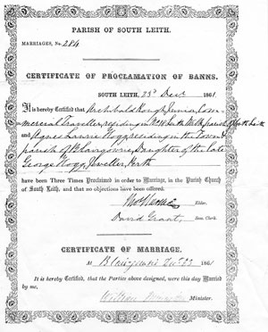 Agnes married Archibald Rough on 23 December 1861 in Blairgowrie Perth. They were married by the Reverend William Minniken Minister for St. Catherine’s Episcopal Church at a quarter to 12 AM. Archie had been born in Canongate, Edinburgh on 30 December 1828. He was a commercial traveller residing at No. 18 Leith Walk, Parish of North Leith, Edinburgh. Agnes was living in Blairgowrie at the time. The witnesses were Maria Dobie and Lizzie Rough.