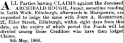 (4) Agnes died without making a will: "BE IT KNOWN, that at the date hereunder written Letters of Administration of all the estate which by law devolves to and vests in the personal representative of Agnes Laurie Rough of 27 and 29 Goodge Street Marylebone in the County of Middlesex deceased, who died on the 24th day of March 1898 at 6 Granville Place Portman Square in the said County a widow and intestate, were granted by Her Majesty’s High Court of Justice at the Principal Probate Registry thereof to Archibald Alfred Graeme St George Rough, of 27 and 29 Goodge Street aforesaid Esquire the natural and lawful Son and only next of kin. Of the said intestate, he having been first sworn to administer the same according to law. Dated the 31st day of May 1898 Gross value of Estate … £ 876. 15. 9 Net value of Personal Estate £ 850. 7. 9