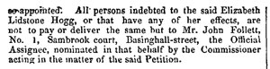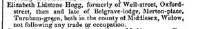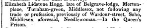 Elizabeth Lidstone Hogg, late of Belgrave-lodge, Merton-place, Turnham-green, Middlesex, not following any trade or profession, previously of Wardour-street, Soho, Middlesex aforesaid, Needlewoman.- In the Queen's Prison. Gazette 8th June 1844