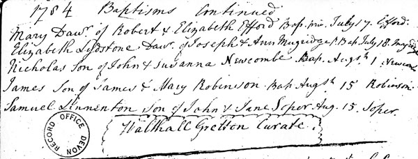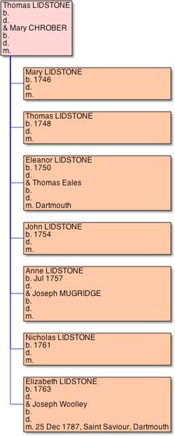 Hugh had records of an Ann Lidstone baptised at St. Saviours Dartmouth in 31 July 1757, the daughter of Thomas and Mary (Chrober) Lidstone. He notes that she must have left Dartmouth as he has records fully covered for all parishes there.