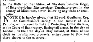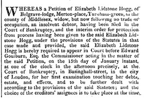 Town Insolvents ..The following prisoners, having filed their Schedules, are ordered to be brought up before the Court, at the Court House, Portugal Street,Lincoln's Inn Fields...On Thursday, the 11th day of July, 1844....Elizabeth Lidstone Hogg, Belgrave lodge, Merton place, Turnham green,not in any business. Bells New weekly Messenger 30 June 1844, p 7