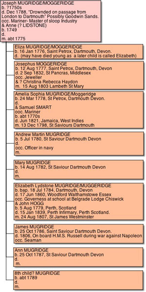 "Petition of Ann Mugridge of Dartmouth in the county of Devon widow of Joseph Mugridge thirty five. That your petitioners ? husband was bred to the sea and served there as master of the sloop London and his ? schooner both called Industry for upwards of 13 years has left 7 children from ages of 13 to one year old and is now pregnant. He was drownded on 26 December last on his passage from London to Dartmouth which trade ?held/hand." Trinity House Petition 1789 viewed on fiche of original at SOG (Series 2 Book 5) (Thirty five is crossed out. Her aged is noted as 40). If 1788 is when Joseph died and the Napoleonic Wars were 1803–1815, it is not possible that he fought in them. The James mentioned in the family story may be Elizabeth's brother James from HMS Russell rather than her father.