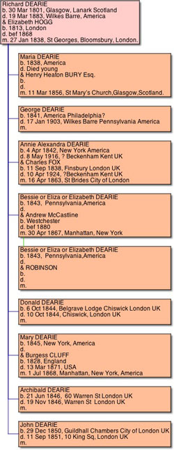 A George Dearie appears on the 1870 census at Harrisburg, his occupation is " hotel clerk", and his name is written after the other children of the family, so this could be him. The head of the household is John Dearie " hotel keeper", although this John does not appear to be the correct age to be George's Uncle. However it seems to be the same family that we find on 10 July 1880, going by ship to Glasgow with Richard Dearie, and Mrs. Mary Cluff, Mrs. John Dearie, Miss Lizzie Dearie and Miss Tillie Dearie. George moved to Wilkes-Barre where he was a clerk in 1871. On 1 May 1876, Richard applied for a licence for a restaurant. The Dearie's resided at the Exchange Hotel on the east side of Public Square in 1875, 76, & 77.