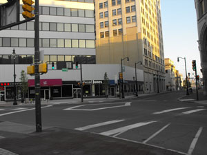 "Dearie's Corner" Public Square in Wilkes-Barre, the corner of the west side of Public Square and West Market Street today , photographed in May 2011. The name Dearie was associated with this corner for nearly 25 years.