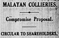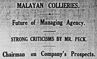 In January Malayan Collieries announced a dividend of 10 %. On the 26 January the papers reported that the monthly wages bill, ($100.000) to Malayan Collieries was accompanied by an armed guard, because an attack had been expected.