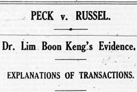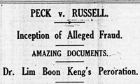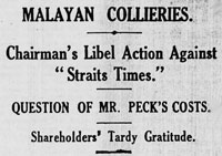 Hong Guan issued a writ against Archie in Singapore on 18 May. There was a lull in the letters for 10 days until another letter on 26 May demanded Archie’s answer. On 5 and 6 June the Straits Times and the Malay Mail carried J. A. Russell and Co.’s detailed reply, which was a copy of a circular that had been sent to all the shareholders. It refuted the allegation that the option on the Poemoekan mine belonged to Malayan Collieries and was diverted to J. A. Russell and Co., in order for them to make a profit. In great detail, (nearly 6,000 words) the circular set out the process by which Ng Hong Guan, acquired the option and sold it to J. A. Russell and Co., and they sold it on to Malayan Collieries. It considered that J. A. Russell and Co. were independent and under no moral obligation to Malayan Collieries, and that it was a transaction in the ordinary way of business: “ and we feel confident that …it must be apparent that we have done nothing contrary to our duties as Secretaries and Managing agents of Malayan Collieries Ltd.” They were not prepared to discuss the profit they made: “the amount which in turn has to be paid to prior vendors and others, together with the names and nature of the interests of such persons is no business of the purchaser.” The circular was summarised and discussed in The Singapore Free Press and Mercantile Advertiser of 7 June, who pointed out that Mr. Peck will have something to say about it and that the issue is:” the more complicated because of the confusion between Mr. Russell himself, Mr. Russell as a partner of J. A. Russell and Co. and Mr. Russell as the agent and a director of the Malayan Collieries". On 9 June Mr. Peck’s response was published. Included in it were two letters written by Archie to Ng Hong Guan, which he said, proved that Archie was acting on behalf of Malayan Collieries.