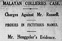 The case began on March 17th and lasted for 22 days. The newspapers reported that the Peck v. Russell case was the most important in the Malayan courts for many years because it questioned companies’ use of Managing Agents, and involved such a large sum of money. It would also be the largest ever heard with enormous volumes of files, minutes, correspondence and evidence. Mr. Peck was suing Archie for $1,720,000 damages that he alleged Archie had fraudulently made out of his sale of the Pamoekan Bay coal mine to Malayan Collieries. For the whole of the first 4 days of the trial from the 17- 20 of March, Mr. Braddell, the lawyer for Mr. Peck, outlined the charges: that Archie had not bought the mine for J. A. Russell and Co., that he had not disclosed the true facts to Malayan Collieries when he sold it to them, and that as a director of Malayan Collieries and agent of Malayan Collieries he was in breach of his duties, that the Company had refused to take action because Archie controlled the majority of the votes, and that he had kept his profit of 80,000 shares a secret. It is clear that Mr. Braddell is seeing this as a test case for rules over the protection of capital and investments in Malaya by investors all over the world. In England companies had their own staff but in Malaya nearly all firms were run by firms of agents: “this was not merely a case of a director of a company who had sold his property to the company. It was a case brought against the company’s managing agents, whose managing director was also chairman of the company.” The fifth day, 21 March, was taken up by Mr. Braddell with the legal side of the case. The Malay Mail, which reported the trial verbatim commented on his lucidity, eloquence and logic and said it was a remarkable feat of physical endurance.