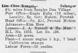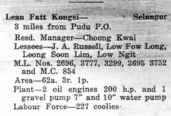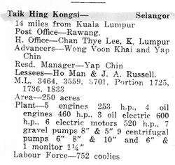 Ho Man who is listed as a partner in the Taik Hing Kongsi near Rawang had been the contractor for the open cast mines at Batu Arang and considered by Archie as a possible partner in the development of Pamoekan Bay if Malayan Collieries had not bought the option.
