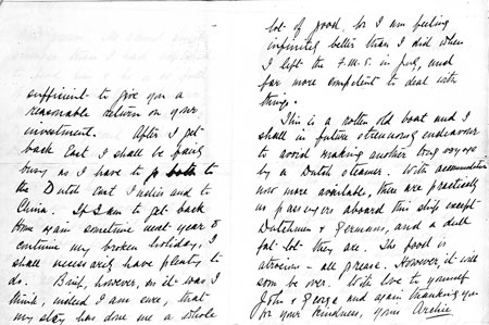 Kathleen Archer interviewed in the 1980s told this story about meeting Archie: She had a friend called Wanda Fish who was in love with the Dutch Attaché in London. Unfortunately he was not in love with her. A Mr Howden wanted to marry Wanda but he was stationed on a gunboat in Shanghai for seven years. Wanda, having decided that the Dutch attaché Otto, didn’t want her, decided to go out and marry Mr Howden. She asked Kathleen to go with her. They sailed on the Montcalm from Liverpool. They crossed North America and sailed from Vancouver to Japan. When they reached Shanghai Howden wasn’t there. They stayed at the Cathy Hotel for ten shillings a day, all meals included. It was very French and glamorous. Howden finally returned. He spent all of one night talking to Kathleen about whether he should get married or not. They finally embarked on a small river steamer belonging to Jardines to go to Hankow. There had been an offer to Kathleen to visit Peking but she declined and always regretted that decision. On the evening before the wedding Howden asked Kathleen whether he ought to marry Wanda. They did get married. Kathleen had a blue and white striped dress, which she washed and it all ran. Kathleen returned to Shanghai and then sailed for Penang to meet a friend called Pat Denier whose husband was employed by the Hong Kong bank. Pat Denier asked Kathleen to get off the boat because she was not speaking to her husband and she needed someone to talk to. Kathleen agreed to spend ten days with Pat. Kathleen booked back on the P. and O. Ranpura. The boat was a mass of streamers, there was general uproar and it was all very jolly. Kathleen and the Deniers and other friends were sitting at one table and Kathleen noticed a man at another table. He was covered in garlands and talking to both Chinese and Europeans. Kathleen asked who he was. The answer was: “Oh he is Malaya”. During the first stage of the voyage Kathleen considered Archie a bluestocking and warned him off. At every port Archie asked her to go out with him. Consequently they shared entertaining experiences, for example at Aden. In Port Said fortune-tellers came along side the ship and Kathleen was told that “something will happen to the lady in September but the gentleman will not be so lucky”.