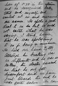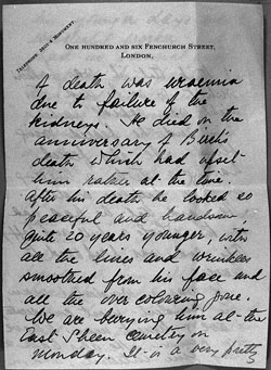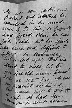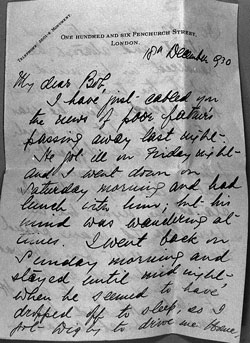 My dear Bob, I have just cabled you the news of poor fathers passing away last night. He got ill on Friday night and I went down on Saturday morning and had lunch with him, but his mind was wandering at times. I went back on Sunday morning and stayed until midnight, when he seemed to have dropped off to sleep, as I got Digby to drive me home.