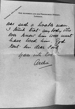On 7 July Archie signed his will, countersigned by John Drysdale, appointing his brother Don, H.H. Robbins and Andrew Beattie of the London Branch of Loxley and Co as trustees. He wanted them to keep the businesses going. He left money to his new wife, to his brothers and their wives and children He also left money to his godsons and to several female friends, and to his London doctor and London chauffeur. He left an annuity to Dolly Godwin but Pud Swettenham was not mentioned. However he made alternative financial arrangements for her which were paid through J. A. Russell and Co. and in later years were a larger ammount than Kathleen received from the trust fund.