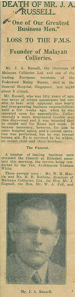 The following day, 30 March , the Straits Times Leader article backed down on its previous criticism saying: “A very full and detailed reply to the comments made in this column last week on the payment by Malayan Collieries of a fifteen per cent. dividend at a time when their principal customer, the F.M.S. Railways, are running at a heavy loss, was made at the annual meeting of the Collieries company yesterday. In the absence of Mr. J. A. Russell, whose serious illness has aroused anxiety among all who are concerned to see the industries in this country conducted with efficiency and foresight, Mr. H. H. Robbins dealt with our criticisms, and did so very effectively and at the same time with a moderation which is duly appreciated.”