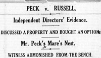 On 11 January the Supreme Court resumed Mr. Peck’s case against Archie, when further arguments over whether Mr. Peck as a shareholder had a right to sue were made. For a whole day Mr. Peck’s counsel, Mr. Hastings cited many previous cases to show that when the directors of a company refused to take action a shareholder could sue. On the 12th another day was spent by Mr. Hastings arguing for his client’s right to take action. His Lordship Mr. Justice Farrer-Manby, reserved judgment until 23 January, when the papers reported the full text of his decision, in over 4,000 words, that the action had been dismissed, and that Mr. Peck could not bring his case as it was, but if he paid the costs to date and his plaint was amended within 21 days, it could be heard.