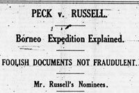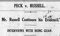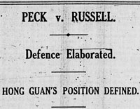 In order to stop Mr. Peck, Archie’s solicitor applied to the Supreme Court on 9 August to have the case heard in Privy Council. The application was postponed until the next court of appeal. On 26 September the case was heard. Mr. Shearn argued that the case was of sufficient public importance to go to Privy Counsel. Mr. Braddell for Mr. Peck said this was “, a most vexatious application and quite unnecessary. It was well known that at the Chancery side in England litigation can be hung up for many years by continual interlocutory applications and appeals and further appeals and then more interlocutory applications. There were innumerable decisions which could be quoted to show that this particular order was beyond all dispute an interlocutory order. He submitted that to allow them to go to Privy Council would be a great injustice to the plaintiff as it would enable them to spend the plaintiff’s money uselessly because everything they wanted to go to Privy Council about was opened to them at the actual trail. The only possibility, said counsel in conclusion, why they wanted to go to Privy Council was to keep Mr. Russell out of the witness box and to use up the plaintiff’s money. It was well known that Mr. Peck was acting on subscriptions from shareholders and the amount was nothing like the wealth at the disposal of Mr. Russell.” The three justices agreed with him and the application was not allowed.