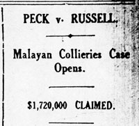 On 4 November Mr. Hopson Walker, a Malayan Collieries shareholder, wrote to the Straits Times, expressing surprise at Malayan Collieries lack of support for Mr. Peck, and calling for shareholders to support him. Meanwhile on 7 November Hong Guan was in court in Singapore for debt, (not for the first time), and was told to pay up within 14 days or he would be arrested and put in prison. Hong Guan’s case against Archie came before the Supreme Court in Kuala Lumpur on 6 November. The lawyers argued about whether the case should stand over until Peck v. Russell was heard. Sir Lionel Woodward decided that it should not and it was scheduled for December.
