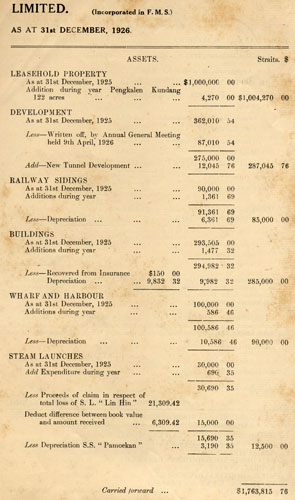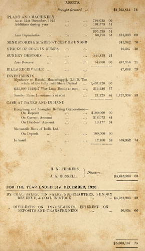You will see that after paying three interim dividends during the year amounting to 22 ½ %, and after allowing for directors' and auditors' fees at the same rate as those paid for 1925, there is a balance of $614,298.92 remaining to be dealt with at this meeting. Your Directors recommend a final dividend of 12 ½ % which will absorb $321,881.25 and will give shareholders a total return for the year of 35% upon their shares. Your Directors also recommend that the premium paid to the Government upon the extra area of 122 acres of State land acquired by the Company at Kundang for the purpose of procuring sand for hydraulic stowage be written off. This sand land is probably of no value except to the Company itself, and is a doubtfully realisable asset, and should therefore, your Board consider, be entirely written off. During the year the cost of driving a new tunnel, amounting to $12,045.76, has been added to Mine Development Account bringing this total to $287,045.76. Your Board recommend not only that this $12,000/- odd should be written off, but that the Development Account should be still further reduced to $175,000/- by writing off it a total sum of $112,045.76. Your Directors desire gradually to extinguish this Development Account altogether. These writings off will leave us a sum of $176,101.91 which we recommend be carried forward to the 1927 Balance Sheet. It is approximately the same balance that was carried forward at the end of 1925