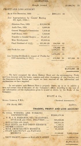 The Report and Accounts having been in your hands for the required period, I propose, with your consent, that they be taken as read. I again have the pleasure of being able to report another record year both in regard to gross revenue and to profits. It is true that the increase in the latter item, profits, over the figure for last year is not very great; but it indicates continued progress in the right direction. The increase in gross revenue, however, amounts to the more substantial sum of $600,000/-, the total for the year being now just over the $5 million mark. These larger receipts are mainly due to bigger coal sales, and not to any increase in our selling prices. During the year, as you are aware, wages rose considerably, involving the Company in a large increase in costs, and but for this the profits would have been greater. In view, therefore of the general rise in all costs, it is very satisfactory to be able to record any increase at all in the amount of our annual net profits. I am happy also to be able to report to you that while costs per ton would now appear to have reached their limit, the Company's sales still continue gradually to expand. Despite a largely increased turnover, you will perhaps notice that the total amount paid by the Company during the year under review in coal royalties is actually lower than it was for the previous one. This is due to two reasons: firstly, that we pay a minimum total royalty upon our Borneo coal, which minimum total has in previous years never been reached, and, secondly, that a reserve which we created for the payment of Dutch Government royalties was in excess of what was actually required for this purpose during 1926.