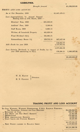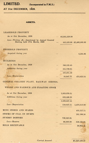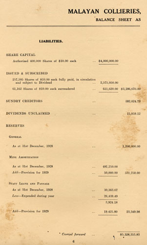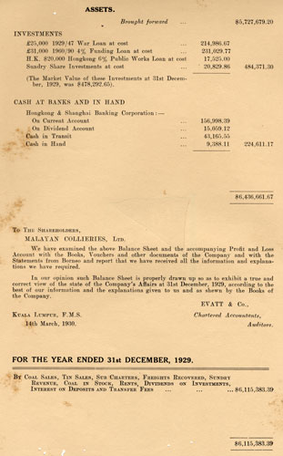 The Straits Times, 1 April 1930, Page 19 and The Malay Mail April 2 1930 page 10. Under the Headlines: MALAYAN COLLIERIES, LTD. Chairman Reviews Year of Progress at Annual Meeting HOPE OF REDUCED PRICES AND COSTS. MALAYAN COLLIERIES MEETING. MORE DEVELOPMENTS. 35 Per Cent. Dividend Maintained. . AGRICULTURE, CEMENT AND BRICKS. . (From Our Own Correspondent) Kuala Lumpur, Mar. 30. The sixteenth annual general meeting of Malayan Collieries, Ltd., was held at midday at the offices of J. A. Russell and Co., managing agents and secretaries of the company, today, Mr. J. A. Russell, chairman of the company, presiding. (From the M.M. The chair was taken by Mr. J. A. Russell and those present were Messrs. H.N. Ferrers, W. H. Martin, F. Cunningham and H.H. Robbins (directors) and J.D. Morrison, C.A. Mathews and C. Crompton (Shareholders.) Addressing the meeting the Chairman said: The report and accounts having been in your hands for the required period may I assume that it is your wish that they be taken as read. It is my pleasure to be able to report to you another record turnover, and, while the increase in profits is not as great as was that occurring between the years of 1926 and 1927, and 1927 and 1928, in view of the reduction in our prices, I trust that you will consider even a small increase in profits as eminently satisfactory. Production at Batu Arang was just under 20 per cent, up on the previous year, while that at Pamoekan Bay was substantially the same as for 1928. The net price realised for our Rawang coal shows another reduction on the previous years; our policy is to strive further to cheapen it. We are happy, however to be able to tell you that although the tendency of our sale prices is downwards, so also is that of our production costs, and that under normal conditions the one should more or less offset the other. With reference to the Dutch company operating at Pamoekan Bay, I regret to say that, due to the enforcement of new Government rules, we have suffered from considerable labour troubles with our Chinese miners; but am happy to be able to inform you that at a recent meeting at Batavia with the head officials of the Netherlands East Indies Labour Department we were kindly given the opportunity to state the company’s case and were promised a special and sympathetic consideration of the company’s peculiar circumstances and difficulties. 0. Programme of Re-equipment. 0. It is also a matter of gratification that the N.E.I. Government, so I understand, is at least seriously considering the subject of converting Pamoekan Bay into an open port. When this is done the colliery should be much more favourably placed to conduct its mining operations and to sell its coal. 0. The accounts before you are similar in general detail to those for the previous year. During the twelve month a grant of land was bought at Batu Arang and also one at Fraser’s Hill; and these are the reason for the new item “Freehold Property” introduced into the balance sheet. Our programme of re-equipment with modern plant, and of increased general mechanization, was actively pursued during the year. 0. Buildings and general plant were added to at the cost of $771,427.05, the whole being depreciated by $179,408.36. All buildings erected during the period under review of the permanent type, calculated to last for many years. The plant installed was of a general nature; but the new power plant was by far the largest individual item of it. 0. The deprecation allowed, making $400,000 in two years, was sufficient to reduce to a nominal figure the book value of all plant which it is intended under our programme of modernisation to supersede, and this item next year should consequently be rather less. 0. Plant being Standardised 0. Mine stores and spares show an increase on the previous year of some $68,000, this being primarily due to a quantity of equipment in connection with the new plant which was taken into stores and not issued to the respective works before the end of the year. 0. In this connection, however, the additions to mechanical equipment in hand and contemplated will in future years increase this item of stores by reason of the number of spare parts that will be required. This is a matter which is having the close attention of the managing agents and all possible plant is being standardised in order to reduce as far as is practicable the number of variety of spares carried. 0. Stocks of coal on dumps at the end of the accountancy period were higher in value than at the termination of the pervious year by some $180,000, which increase was due to the congestion of coal in most Eastern markets referred to by the managing agents in their report, and to our plan of holding up at the mine the bulk of our output of Pamoekan smalls until the installation of the washery plant that has been decided upon, which machinery we hope to have in operation early in the second half of this year. 0. Today, however, I am pleased to be able to inform you that stocks of lump coal are again moving off freely, and the quantity which made up the figure of $261,598.50 as at the end of 1929 has since the close of year been greatly reduced, and should be down to normal before the middle of the current one. All stocks have been taken into account at conservative values. 0. A Satisfactory Proposition 0. Sundry debtors and bills receivable were a little down as compared with the previous year, while sundry creditors were a little up. All debts, with a few almost negligible amounts, have since been paid or are secured, and it is estimated that reserve against bad debts of $80,000 is sufficient for all foreseeable contingencies. 0. Investments at the end of the year remain unchanged. I might mention, however, that in view of rumours circulating during the last week in influential quarters of the City of London to the effect that the 5 per cent War Loan, £25,000 of which we hold, is to be converted into 4 and half per cent Tax