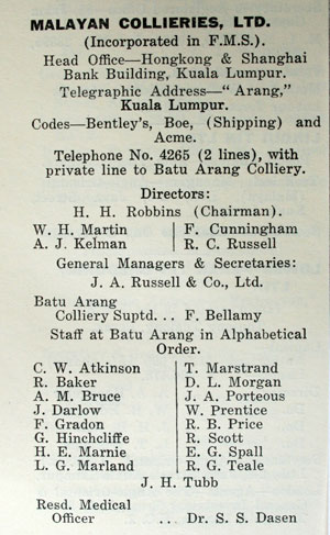 “The staff at Batu Arang has worked loyally and well throughout a very busy and at times exceedingly worrying year and the members have earned the thanks and practical appreciation of your Board.