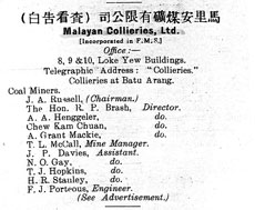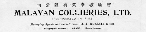 The Straits Times, 29 May 1913, Page 10 . (Letter From J A Russell to Editor) Malayan Collieries, Ltd.
