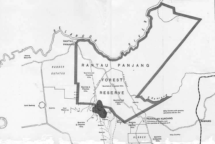 (Report prepared according to instructions in letter of 10th September 1910. Includes a map compiled from several sources “which will be found to differ from the State map published in 1904”. Sir, - During 1908, a Malay named Haji Abdul Hadi, while prospecting for tin ore in the dense jungle that lies to the south of the Rantau Panjang Forest Reserve and west of the Kuang Pengkalan Kundang cart-road, found in the swampy bed of a small stream pieces of black coal, some of which were sent to the office of the inspector of Mines, Kuala Kabu. In September some fragments, weighing about 10 grams, were sent to my office by the Warden of Mines, Selangor. In November, at my request, a larger specimen was sent to me and meanwhile the Mines Department had examined the locality, and steps were taken for prospecting, which continued throughout 1909 and until May 1910, when it was suggested that I should take over the work and utilise the steam- boring plant belonging to the Mines Department, but a decision to leave all further prospecting to private enterprise put an end to the operations and the locality has been practically deserted ever since. 2. In September, 1910. I was instructed to examine the surroundings of the coal with a view to” ascertaining the probability of the extension and occurrence of coal bearing country in areas outside the proposed prospecting licence, and to advise as to tracing the coal to a workable point as close to the railway as possible.” In order to carry out these instructions, the greater part of November and December 1910 were spent in the vicinity of Rantau Panjang, and I now submit the conclusions at which I have arrived. 3. Situation and extent of coal.. 4. Operations by Mines department..5. type of coal..6. classification of coals.. 7. Analysis of coal.. (with table) 8 evaporative value..9. moisture content..10. steam tests.. 11. Price..12. Topography of neighbourhood and seam “whole of this part of Selangor is covered with virgin jungle” 13. View from top of Bukit Panjam.. 14. Rolling hills... 15.. roads..16. jungle drainage.. 17..geology of neighbourhood.. quartzite, clay-slate, 18.quartizite 19. Clay slates..20. shales above coal seam 21. Coal measures soil orange.. Quartzite yellow or reddish..22. relations of coal measures to quartzite and clay slate age of rocks.. 23 coal measures younger than granite..24.. coal measures tertiary.. fossil plants 25. Flora different if coal measures same age as quartzite..26. fossil plants latin names..27. coal made of thin reed like plant.. 28. More fossil plants will identify age.. 29. Conclusion Sketch map shows boundary, best way for railway would be along Klang River and then up unnamed left tributary. 30. Places where more coal may be found marked on map.. 31. May be other patches, patch one square mile is on a watershed which explains its preservation… 32. Searches on other low watersheds… 33. Unlikely to be more on higher granite hills.. 34.thanks to Mr. H. N. Ridley for examining fossils, Mr. A. M. Burn Murdoch conservator of forests, Mr. Mungo Park for help in obtaining coolies. J. B. Scrivenor. Geologist, F.M.S. (Map attached.)