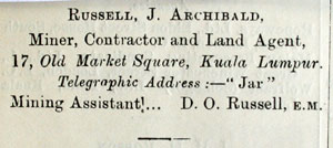 Letter to Secretary to Resident Selangor from J. A. Russell & Co. Miners, Contractors and Land Agents 14 &15 Loke Yew Buildings. Kuala Lumpur Selangor. 11th October 1911. Sir, We have the honour to apply for a 1st class appraisers licence for Mr. D.O. Russell for house property and mining land, and a 2nd class one for agricultural property. At present during the absence of Mr. J. A. Russell a great part of our land agency business has to be hung up until he can return. With regard to Mr. D. O. Russell’s qualifications, he spent five years at the Colorado Government School of Mines from which he graduated with honours, while as to house property he won the Denver city municipal prize for a scheme for town- improvements. He has at the present moment charge of some 77 shops in the towns of Kuala Lumpur, Seremban, Klang, Kajang and Serendah, most of the purchases of which he himself negotiated. We have the honour to be, Sir, Your obedient servants J. A. Russell & Co., J. A. Russell Manager. Document in the National Archives of Malaysia 4761/1911