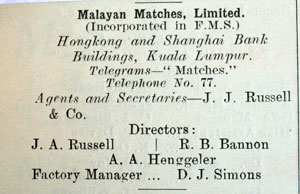 THE MALAY MAIL, FRIDAY OCTOBER 27TH 1922 MALAYAN MATCHES THE ANNUAL MEETING Government and Duty The second annual general meeting of Malayan Matches Ltd., was held on Thursday, 26th October at noon in the offices of Messrs. J.A. Russell and Co., agents and secretaries. Mr. J. A. Russell was in the chair. Present: Major Gough and Mr. James Davidson (Directors) and Mr. H.D. Brown, representing the agents and secretaries. The notice convening the meeting having been read by the secretary, the adoption of the Director’s report and the accounts was proposed by the Chairman who said inter alia:- The report and accounts have been in your hands for the prescribed period and I will with your kind permission take them as read. The report deals with the salient features of the Company’s year, and to render it more useful and informative has been brought up to date as at the 13th of this month. I regret that the producing stage was not arrived at by the close of the financial year under review, but this having now been reached, the yearly accounts should, and I hope will, in future afford more interesting reading. On turning to those now before you, you will notice that the year’s operations were financed for the most part by money raised by the debenture issue. Of the $43,400 issued within the period covered by the accounts only the sum of $2,300 was taken up by shareholders. The Company’s lawyers and architects were good enough to accept $5,100 in payment of their several fees, leaving the balance of the debentures to be subscribed for by your managing Agents and Secretaries, who had given shareholders a promise to take up to $50,000 worth of the issue. To date the sum of $63,500 has been issued, the whole of the extra amount since the close of the year having been advanced by my firm; so its promise to subscribe for $50,000 worth of debentures has been more than fulfilled. Such funds as the Company may still require to finance it during its initial stages of production is also being advanced by my firm. Our bankers, you will notice, are our creditors for a small overdraft on current account of $421.11. Debenture interest is payable on 30th June and 31st December and the item $823.89 represents the three months’ interest accrued. Trade creditors for the most part consist of the contactors for the erection of the main building and of the boiler house and plant. This amount has been reduced by over $6,000/ as at 30th September. On the assets side, expenditure on factory and general buildings increased by $22,861.55, and apart from the cost of covering the costly and unsuccessful Fibrolite roof to the main building with galvanised iron your assets may be regarded as having been increased by this amount. Under the heading “Machinery and Plant,” expenditure increased by $24,909.43, largely on account of power house equipment. Stores and materials were augmented by a consignment of chemicals from Home to the value of $9,421.03 ordered in anticipation of the commencement of manufacture. Of the sum of $13,344.26 for salaries appearing under Development Account, $8,183.26 was in respect of Messrs. Bell’s and Gosswein’s services; although this sum represents but a small fraction of their total cost to the Company. The years operations were fraught with difficulties, not least of which were in connection with staff. As the year under review advanced it became disappointingly and increasingly apparent that whatever might be the capabilities of your former General Manager, Mr Bell, in the way of managing an already established match manufacturing business where he had expert advice always readily available on any technical questions likely to arise, he was very much out of his depth in the organising and establishment of an entirely new match industry under the, to him very strange and unfamiliar, conditions obtaining in Malaya. Your directors realised that Mr Bell was unfortunately the very reverse of the particular type of match man which they required. He had during the course of his experience run very big match factories controlled by his family, but he was nevertheless hardly a practical match manufacturer of the kind the Company needed, and he was too old to adapt himself to conditions other that those to which he had for years been accustomed. Full power was at first given to Mr. Bell as General Manager, until it became apparent to the Directors that his ideas in regard to expenditure were such as the Board could not possibly contemplate with equanimity, and that the Company’s funds were being rapidly exhausted. It later on became also equally clear that despite the heavy expenditure being incurred, practically no progress was being made. It was of course several months before these conditions were abundantly proved and in this way about a year’s valuable time and much money had been irretrievably lost. In July 1921 your directors decided to inform Mr. Bell that if he had the interests of the Company at heart he could best further them by tendering his resignation. The wisdom of this was acknowledged and Mr. Bell’s agreement was cancelled on the 5th August 1921. Mr Gosswein, the German expert erector finally arrived in the F.M.S. during June 1921 and then only under a permit from Government for a three months’ stay. After a delay of practically twelve months in being admitted to the country, during which time the Company had to maintain him in Java, Mr. Gosswein was greatly perturbed at the temporary nature of his permit and when a position offered in Europe he decided to accept it and to return and he left the country in September, 1921, before much of the machinery had been assembled. From September, 1921, the general management of the Company was conducted by the Agents with Mr. Simons the engineer in charge of the Factory. Under this arrangement satisfactory progress was made, but unfortunately the working capital had all been exhausted, necessitating an issue of debenture