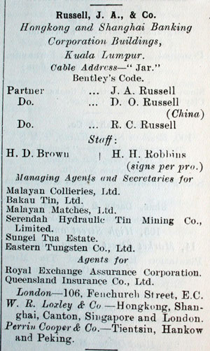 The Straits Times, 11 February 1925, Page 8 and Untitled [Articles] The Singapore Free Press and Mercantile Advertiser (1884-1942), 16 February 1925, Page 8 Amongst Kuala Lumpur residents proceeding on leave in the near future are:…. Mr. R. C. Russell, of Messrs. J. A. Russell and Co….