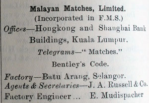 The Straits Times, 5 March 1926, Page 10. Malayan Matches, Limited. The following circular, says yesterday's Malay Mail, has to-day been received from the offices of Malayan Matches, Ltd., in Kuala Lumpur “Dear Sirs, I beg to inform you that, under powers contained in the Debentures of the above Company, I have been appointed Receiver for the Debenture holders and entered into possession of the Company’s assets upon March 1, 1926. As from that date no orders placed by the Company should be executed unless countersigned by me in my capacity as Receiver for Debenture Holders. Yours faithfully, J. W. Fuller”. Malayan Matches Ltd., was floated in 1919 with an authorized capital of one million dollars, of which 525,000 one dollar shares were issued. The Company erected a factory at Rawang near Malayan Collieries, and started manufacturing matches. Its activities were, however, frequently interrupted by machinery and other troubles, and attempts to reconstruct the company failed. Government was induced to impose a protective duty on matches to foster the local industry. Messrs. J. A. Russell and Co., were the Managing Agents and Secretaries of the company. (179 words)