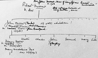 Above: A family tree written by John Russell. Below: click on the button below for a more detailed Mossop family tree. Original sources still have to be checked for most of this information.