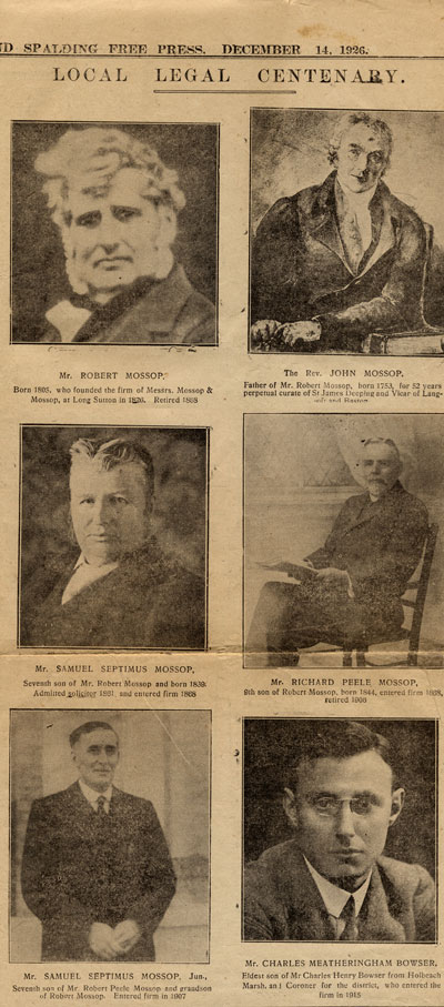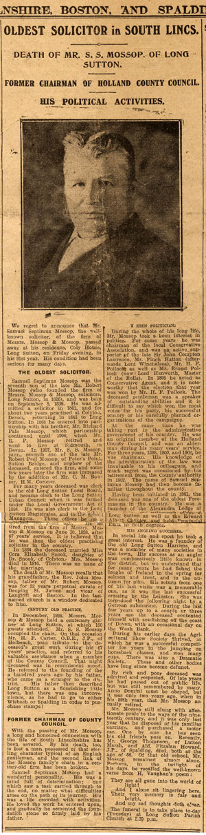 Henry's grandfather was Robert Mossop the founder of the firm of Mossop and Mossop, solicitors of Long Sutton, which became Mossop and Bowser in 1916 and is still going in Long Sutton today, although the last Mossop to work there retired in 1990.
