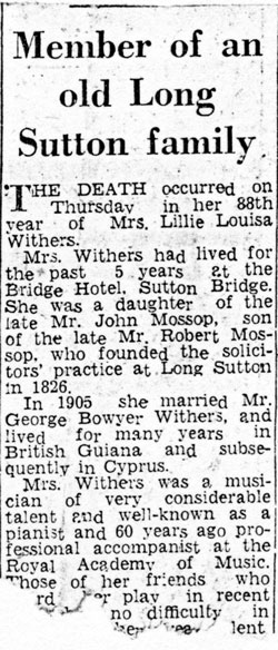 Mary was engaged for years to a man called Withers, but Lily, her sister, went off with him and took him to British Guyana. He was considered a weakling, and the family story is that she forced him to work very hard, and he came back reasonably well off. Their daughter Grace married a man whose surname was Henry, who was a policeman in Cyprus and they had two daughters who lived in Bransgore. There are four addresses for Lily Withers in a 1940 address book of Hidas: in 1940: Pineways, Tiekel Avenue, Camberley. Flat 2, Northcote Lodge, London Road Blackwater. The Old Rectory Bunwell Norwich and The Bridge Hotel, Sutton Bridges Lincs, and for 1927 :Stack House Settle. See the newscutting at the bottom of this page..