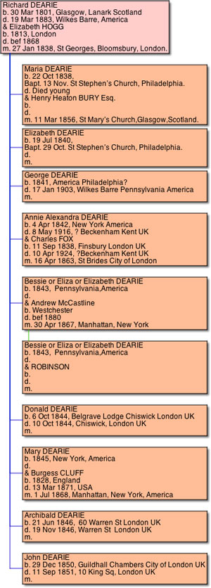 Richard died of pneumonia on March 19, 1883 in Wilkes-Barre. The Wilkes-Barre Record of Tuesday 20 March 1883, p.4 says: "Death of Richard Dearie. Yesterday afternoon Richard Dearie, Esq., died at his residence on South Main Street, aged 83 years. Mr. Dearie was a native of Scotland. He first came to this country in 1836, but after a short sojourn returned to Europe, where he remained several years. On his return here he became engaged in business in New York, and finally in 1870 moved to this city, where he resided until his death. He was well known here, and was respected by all.