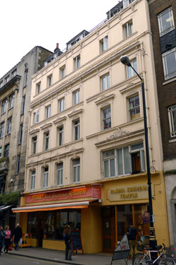 Left: No. 9 Soho Street. Known as Charles Street until 1884. The Fish and Bell was renamed the Coronet by 1895 and was still a pub in 1975 which occupied both the restaurant on the left and the Krishna Temple currently on the site. The Post Office Directory for London for 1849 lists No. 9 Charles Street "Fish and Bell" Richard Dearie. Next door at No. 10 was Egbert Lamley, tailor, and at No. 12 Moses Cohen, curiosity dealer. The rate books for March 1849 for Charles Street: Name of occupier: Richard Dearie, House, rateable value £49, rate at 8 in the £, £1 12s 8d. Amount Collected £1 12s 8d. Richard was bankrupt by June 14th 1849 and the lease was sold at auction.