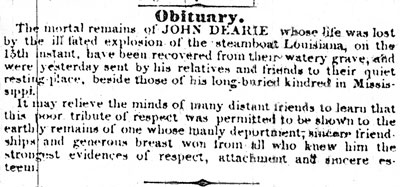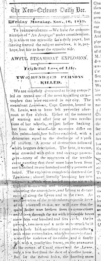 We are sincerely distressed at being compelled to record one of the most appalling catastrophes that ever occurred in our city. The Steamboat Louisiana, Capt. Cannon, bound to St Louis was to have left yesterday afternoon at five 'o clock. Either at the moment of starting and after one or two revolutions of her wheels, or just before backing out of the wharf- for accounts differ on this point-both her boilers exploded, with a detonation equal to a park of artillery. A scene of destruction followed which beggars description. The boat it seems was crowded with cabin and steerage passengers- many of the spectators of the terrible event averring that there must have been from 100 to 150 persons on board. The explosion completely shattered the Louisiana, almost literally breaking her into fragments, which were hurled into the air with frightful momentum and velocity, obscuring the atmosphere and falling at distant spots all along the Levee and into the river. As an illustration of the tremendous projectile force of the liberated steam, we will state that the main boiler had broken from its connections and driven through the air with irresistible force more than 150 yards. On its passage two men and a mule were struck by it and killed. In descending it came into collision with some cotton bales, which fortunately diminished the violence of its course, and it finally fell with a prodigious ?? on the pavement at the corner of Canal Street and the Levee, only a few feet from the door of a coffee house. But for the cotton bales the hurtling mass would have inevitably been projected into the coffee house and occasioned a serious destruction of both life and property.