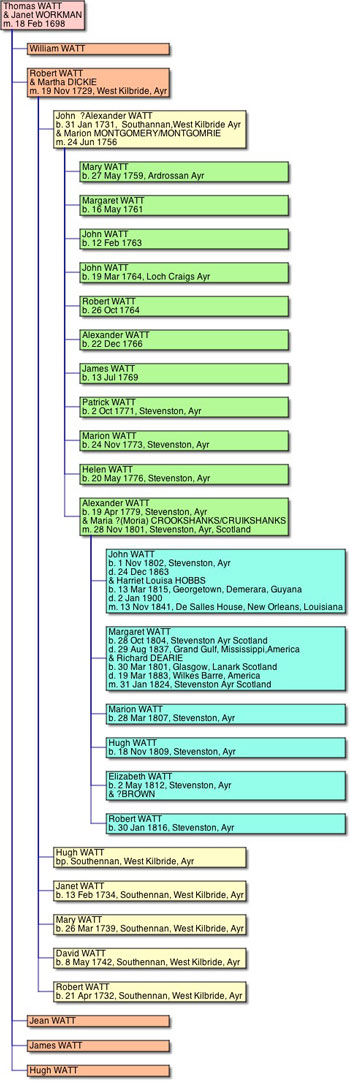 The ship’s passenger list for the “Agnes and Anne “ shows Hugh Watt, with Mrs. Watt, (his mother?) his sisters Marion and Elizabeth, and Margaret, with Margaret’s five sons. They arrived in New Orleans on the 12th August 1836.